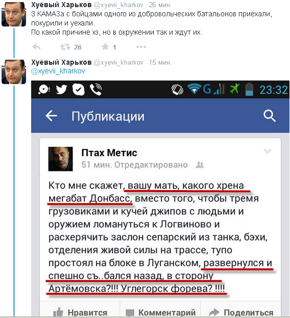 Так, кажется, принято писать теперь? Звонок из Алчевска. Возле горисполкома стоит машина с громкоговорителями и вещает: "Товарищи! Записывайтесь в ополчение! Помогите правительству отбить атаку фашистов, которые наступают по всем фронтам! Станьте на защиту ЛНР! После победы, вы вернетес ...