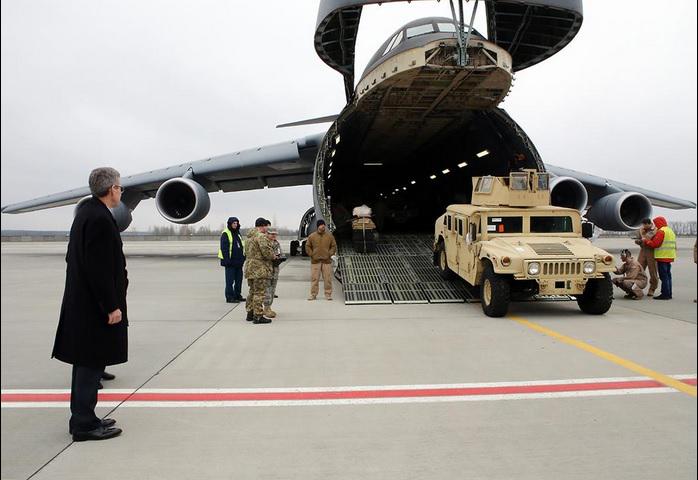 Не успел транспортный С-5 "Galaxy" покинуть небо Украины и вернуться в родимую техащину, как его коллега сегодня уже приземлился с очередными подарками для ВСУ от ВС США - новой партией HMMWV, а проще говоря хаммеров. Груз лично встречал посол США в Украине - Джеффри Пайетт. Примеч ...
