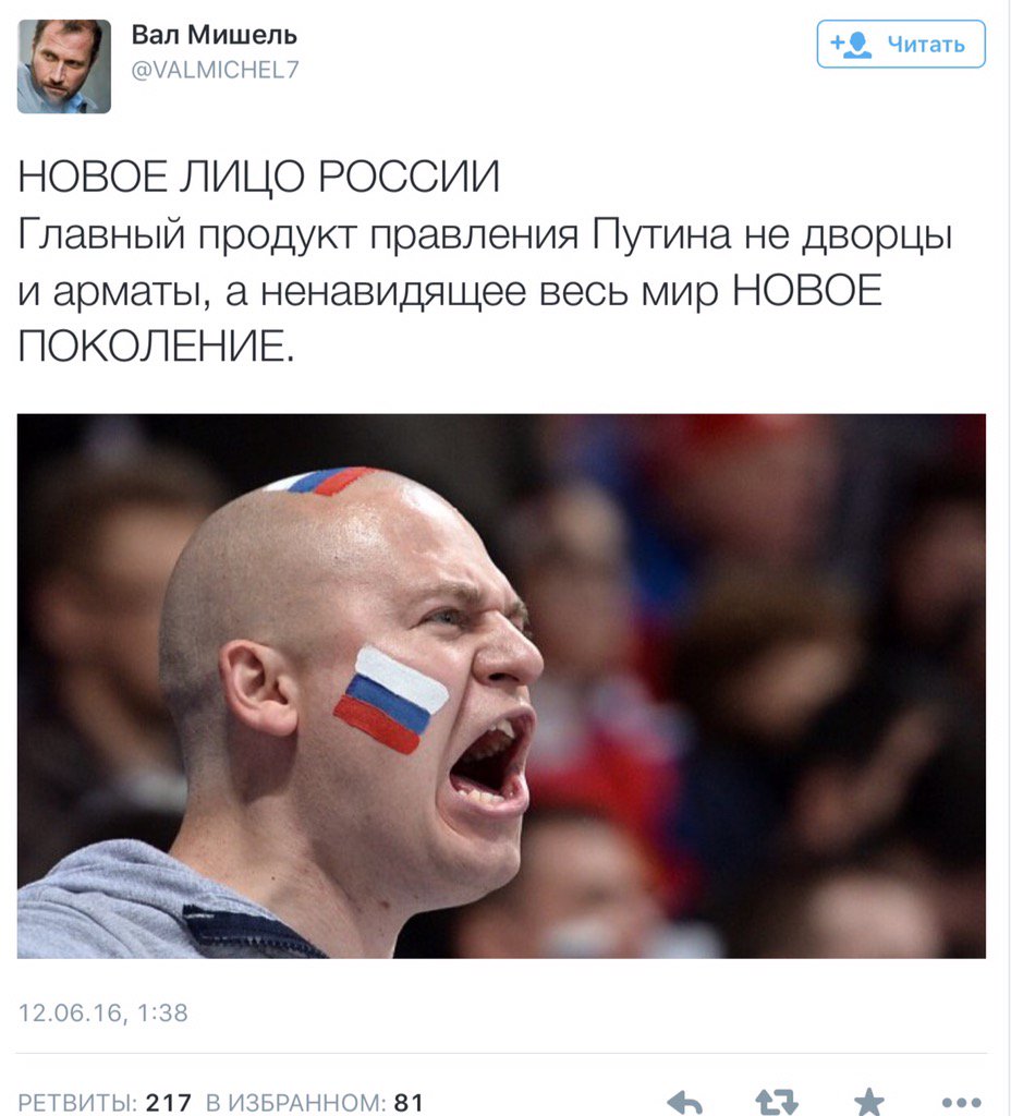 Вчера "русский мир" показал свое истинное лицо. Его показали и сами российские фанаты, устроившие в Марселе настоящее побоище, его показали и российские журналисты, поддержавшие эту вакханалию и даже восхвалявшие её в новостных лентах, его показали и российские официальные лица, делавшие ...