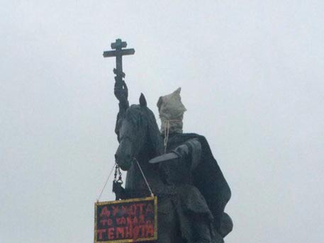 А в зубы коню, на котором восседает царь, табличку с надписью: «Духота-то какая, темнота…». ...