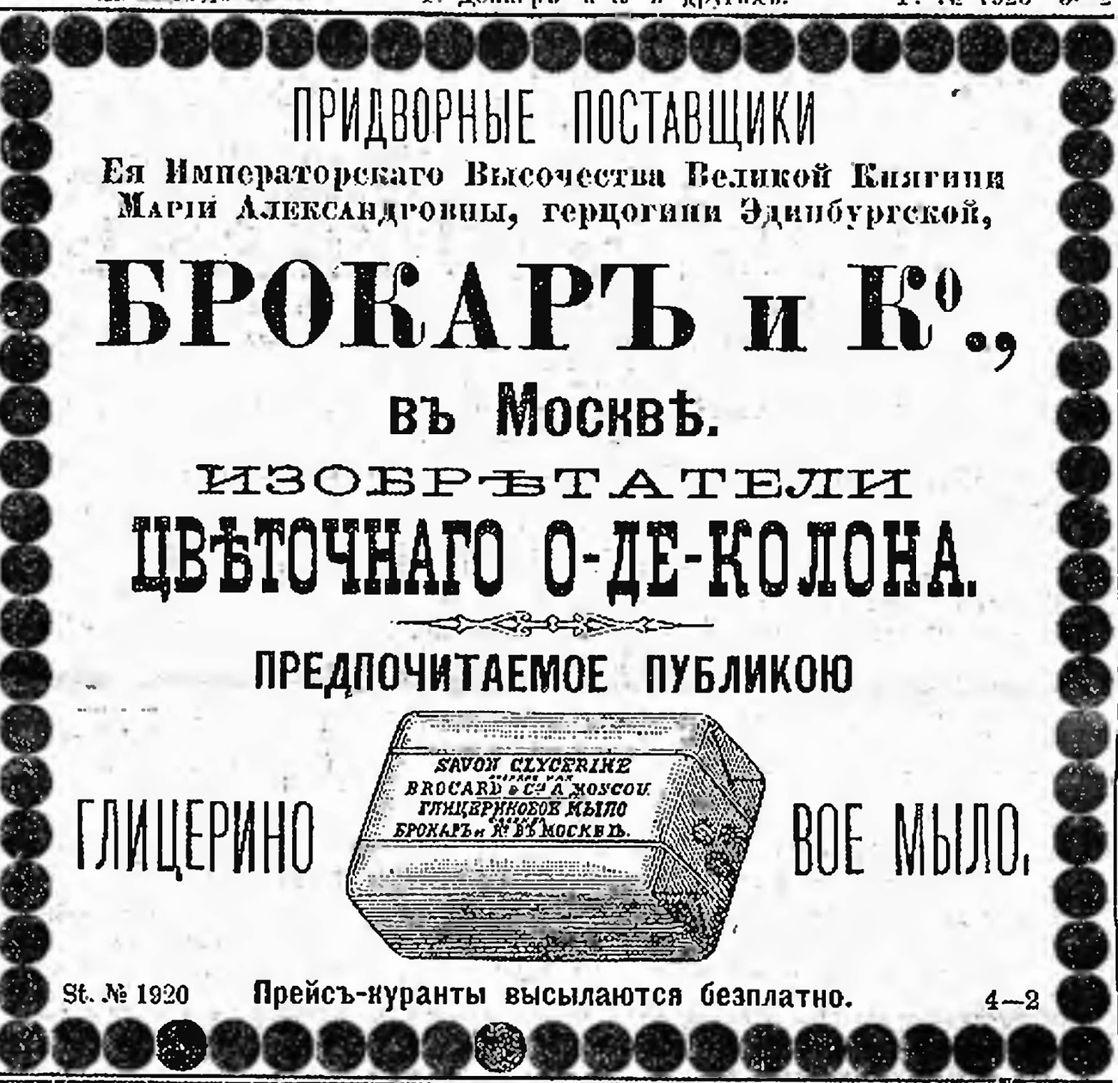 «Если Сытин научил страну читать Гоголя, то француз Генрих Брокар, приехавший в Россию в 1860-х годах, её умыл, — говорит Елена Калмыкова. — Свои капиталы он заработал на мыле, которое стоило одну копейку и было доступно всем».