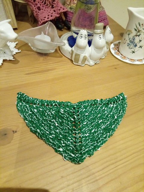 На лисе - шаль спицами из смеси YarnArt jeans (темно-зеленый) и Tweed yourself (белый). Треугольная, лицевыми петлями