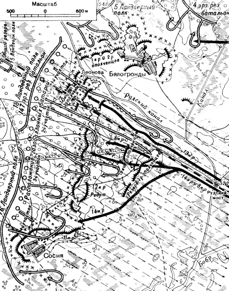 Начальник Сосненской позиции капитан Потапов выдвинул из резерва роту ополченцев, которая заняла последний (тыловой) ряд траншей на бугре, после чего запросил подкреплений у командования гарнизоном. Генерал Бржозовский приказал артиллерии крепости поставить огневую завесу на первой и второй линиях траншей Сосненских позиций (чтобы не дать немецким подкреплениям приблизиться к уже прорвавшимся вперёд ротам), а командиру 2-го отдела обороны полковнику Катаеву – нанести контрудар уцелевшими ротами Землянского полка.