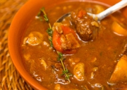После чего я заливаю говяжий бульон и сухое красное вино. Добавляю несколько веточек тимьяна и ставлю на небольшой огонь тушиться в течении 2,5 часов