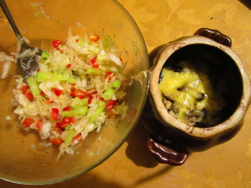 На ужин вчера был другой жюльен, с курицей, и новый салатик из капусты - всё в рамках очередного предновогоднего марафона по разбиранию всего и вся, с частности не вписанных еще в новый блокнот рецептов))