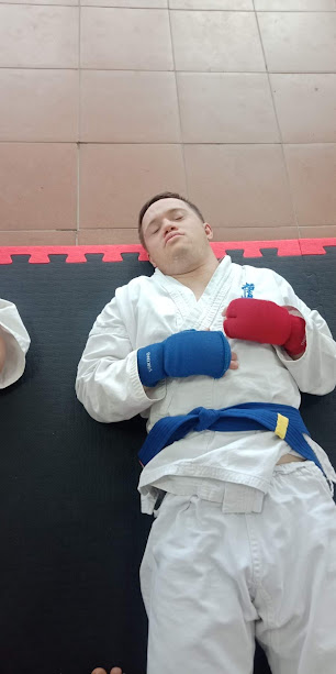 А это с карате - не помню, показывала ли. Минутка отдыха. И желтую насечку видно - а сдавать будет на целый желтый пояс. А Ванюшка - на зеленый.