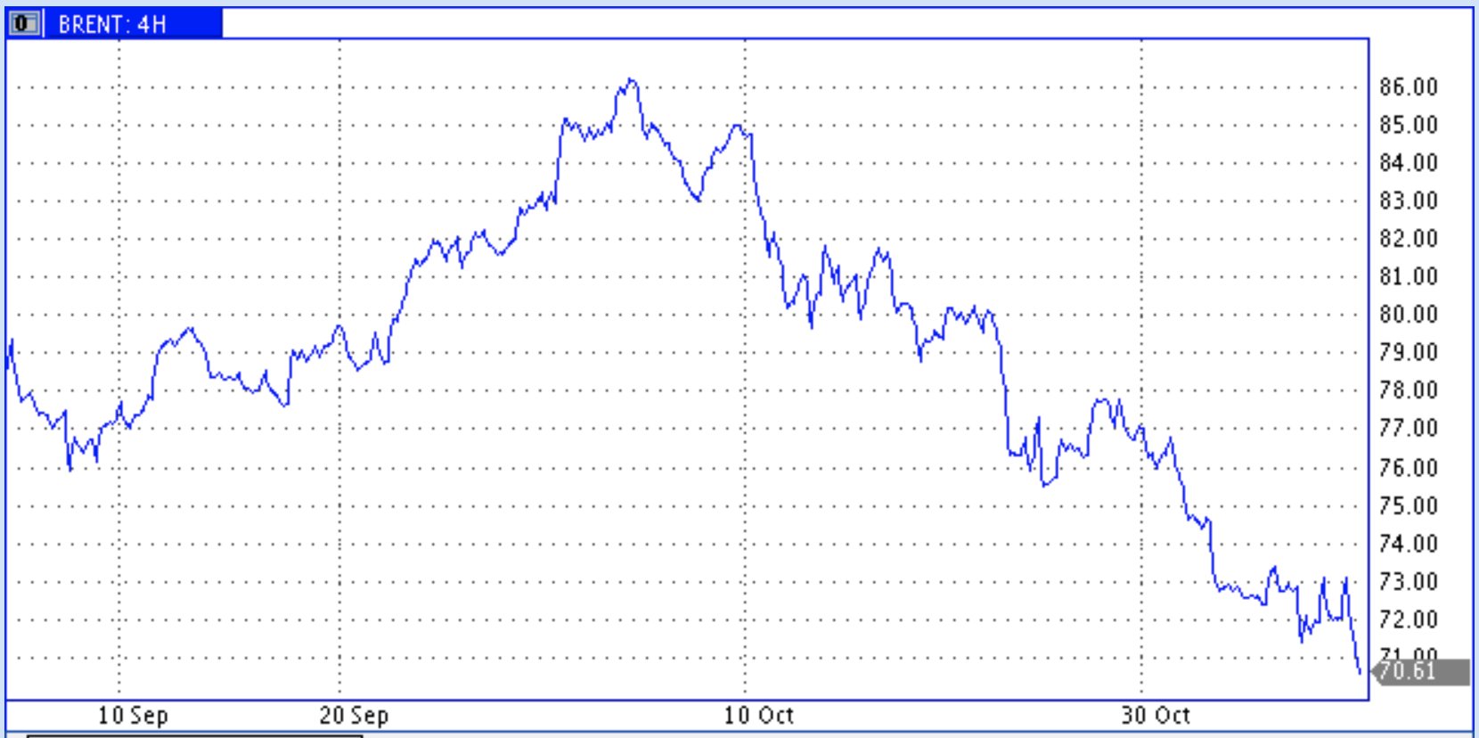 Цена североморской нефти Brent тоже падает с начала октября, когда она превышала $86 за баррель. В четверг Brent торгуется около $71,7 (-0,5%), а в начале торгов опускалась до $71,31, что на 17,8% ниже последнего максимума.