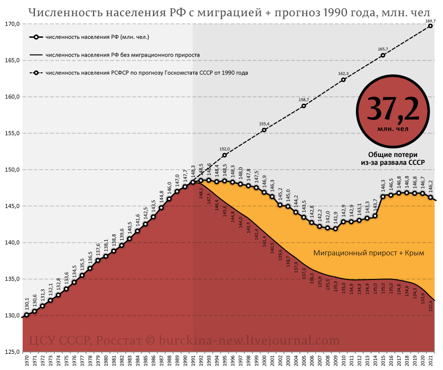 Чтобы увидеть эту очевидную связь, достаточно посмотреть на график численности населения России, которая бодро росла до 1991 года и стала резко падать после 1991 года: