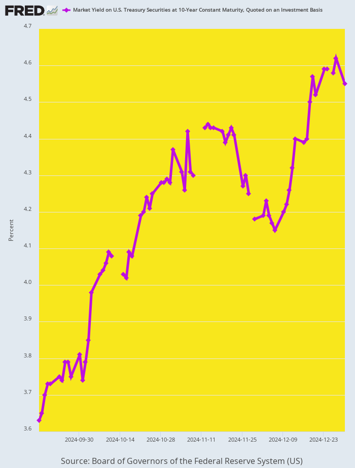 Доходность 10-летних казначейских облигаций США с сентября 2024 года по декабрь 2024 года