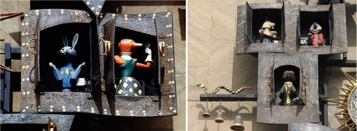 Сверху на часах красуется большой Петух, а в 12 домиках «живут» сказочные герои – например, Ослик, Сова, Кот, Поросёнок, Волк (всего их, соответственно, тоже 12). Каждый час, когда большая стрелка часов доходит до отметки «12», какое-нибудь одно животное выглядывает из окошка.