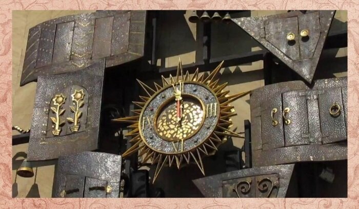 Материалы, из которого сделаны элементы часов Театра кукол, были разнообразны: сталь, медь, латунь, текстолит. Размеры металлического «произведения искусства» – 4 на 3 метра.