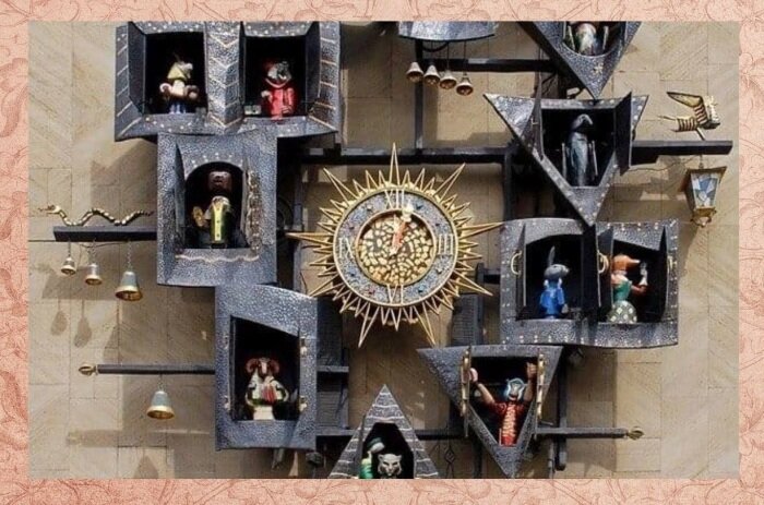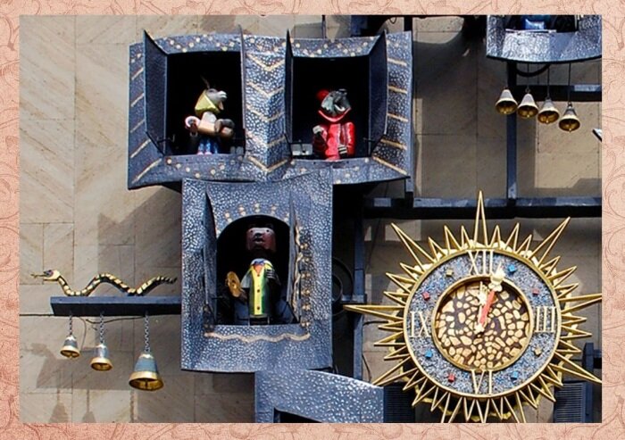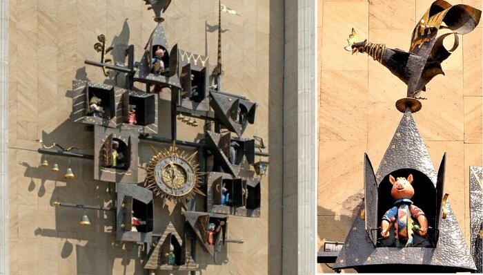 В качестве примера Сергей Образцов, подключившиеся к работе скульпторы Дмитрий Шаховской и Павел Шимес, а также инженер Вениамин Калмансон взяли знаменитые часы в Праге и на их основе разработали наши, советские – сказочные.