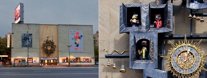 Здание, на котором расположены чудо-часы, построили в 1970-м специально для Театра кукол. Внутри всё было устроено по самым современным для той эпохи меркам – зал, сцена, свет. А оригинальные харизматичные персонажи-куклы сразу завоевали сердца и маленьких, и взрослых зрителей. В общем, отбоя от желающих посмотреть спектакли не было.