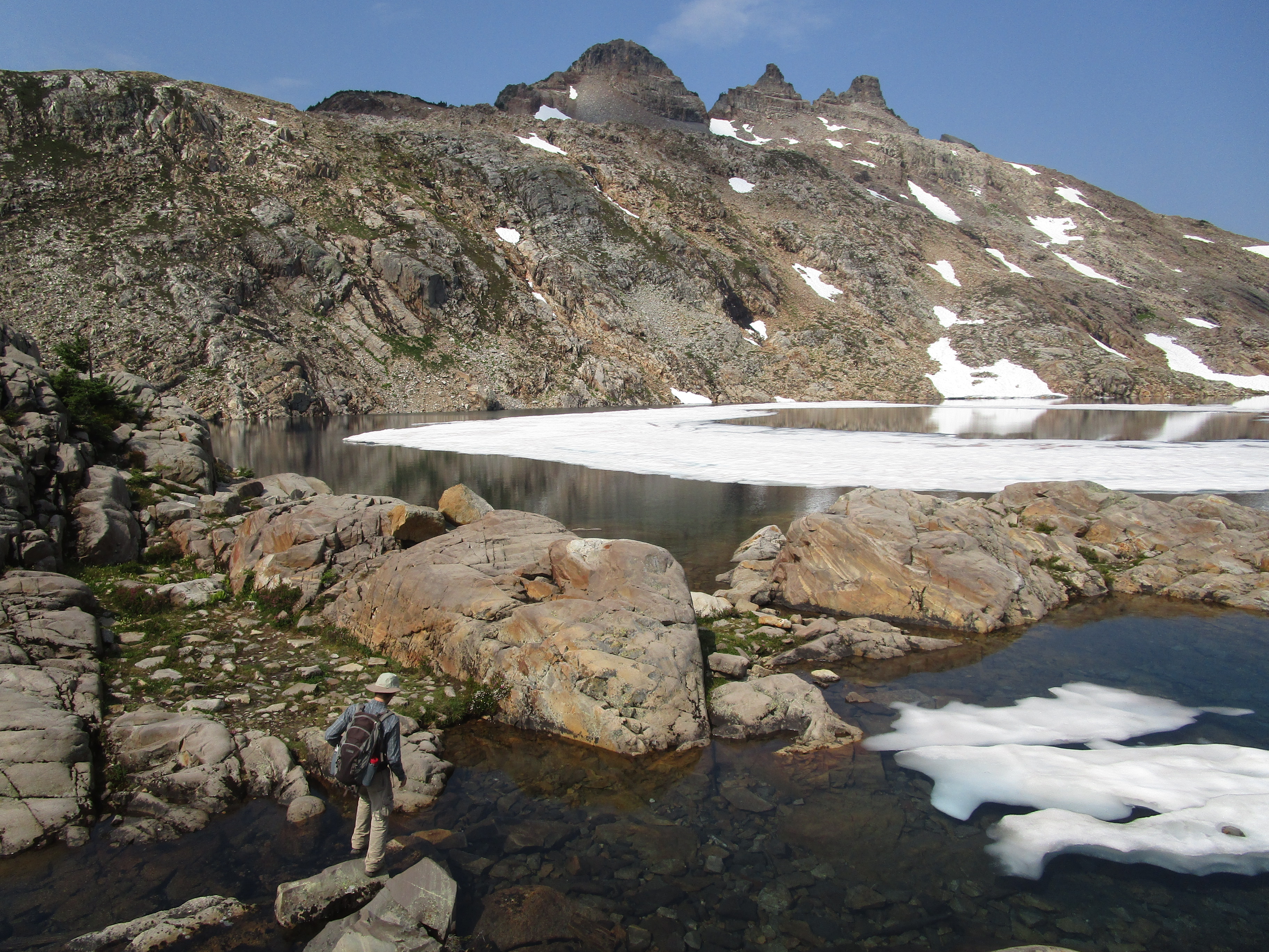 Наконец, через два с половиной часа подъёма на перевал мы добрались до Gothic Basin. Там красиво, и дым не мешает разглядывать близлежащие острые вершины, из-за которых долина получила своё название: