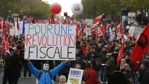 " Против налоговой несправедливости, нет увеличению НДС" - читается на баннере в Париже во главе марша к Министерству финансов. В колонне - оба шефа французской партии Левых, Жан-Люк Mélenchon и Мартин Billard. Прежде всего мы отвергаем налогообложение. Потому что оно работает в интересах богатых, сказал Mélenchon согласно газете "Le Monde".