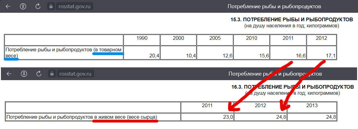 Вот только вся хуйня в том, что потребление рыбы с советских времен в России сильно упало. Причем, настолько, что Росстат был вынужден дважды менять методику расчетов, изменив изначальную методику потребления рыбы в товарном весе, т.е. разделанном, а потом в живом весе, т.е. с кишками, головой и плавниками. В 2018 году они пошли еще дальше, начав считать вес вместе с наледью и производственным потреблением.