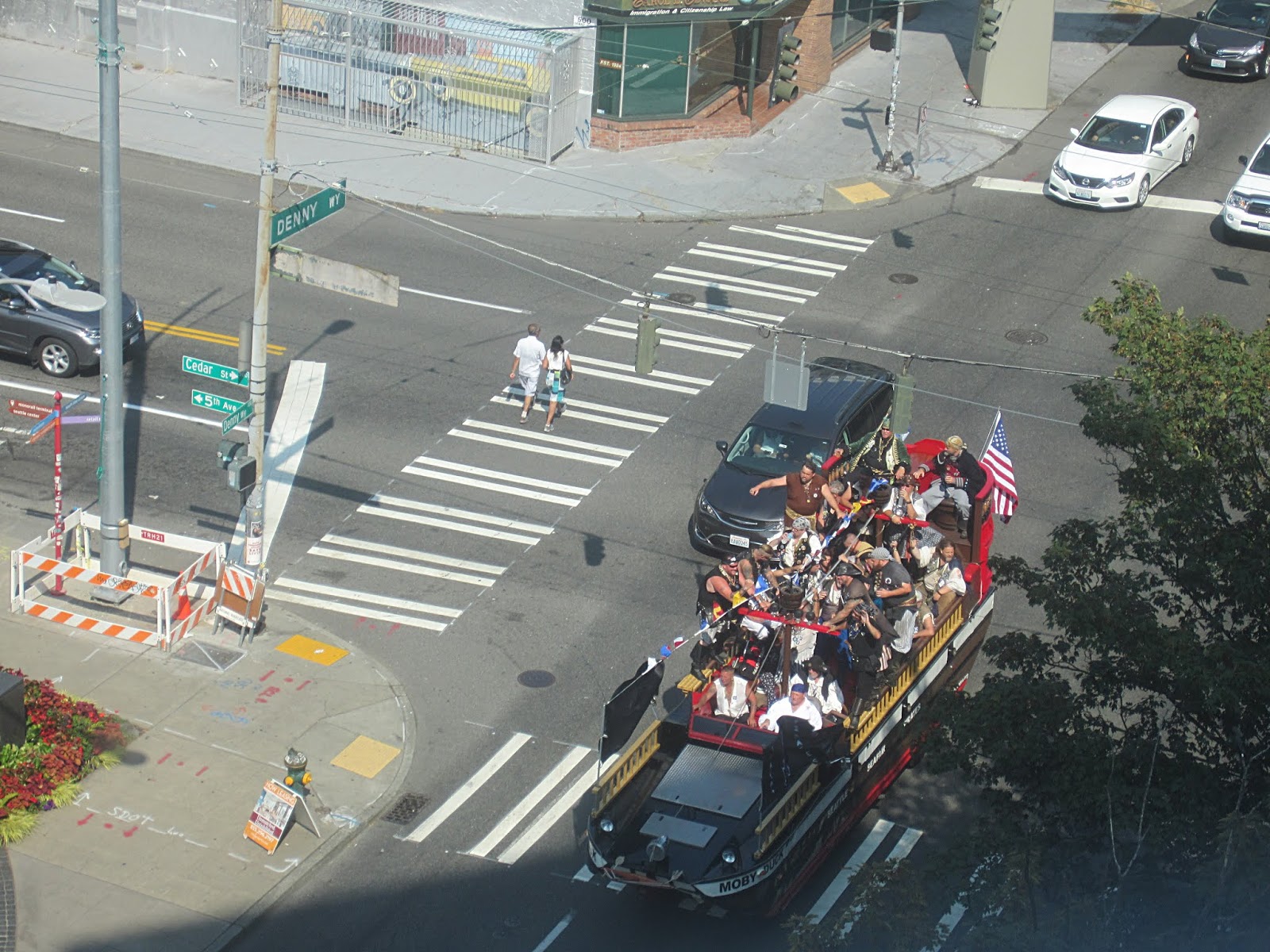 4. В последнюю субботу июля перед нашим домом прошел традиционный Seafair parade. Некоторые зрители расположились вдоль 4-й авеню весьма по-домашнему:
