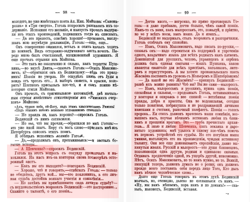 Однако, если зайти на "Викитеку", где выложен очерк Григория Данилевского "Знакомство с Гоголем", то там... этого фрагмента вообще нет. Весь текст есть, а про Шевченко все вырезано. На "ВикиЧтении" текст дан с такими же купюрами. На Lib.ru ситуация сходная. То же самое на сайте ФЭБ (Фундаментальная электронная библиотека). И даже на сайте Gogol-lit.ru, где, казалось бы, собраны все упоминания о Гоголе, очерк Данилевского тоже дан в сокращенном виде — без диалога про Шевченко.