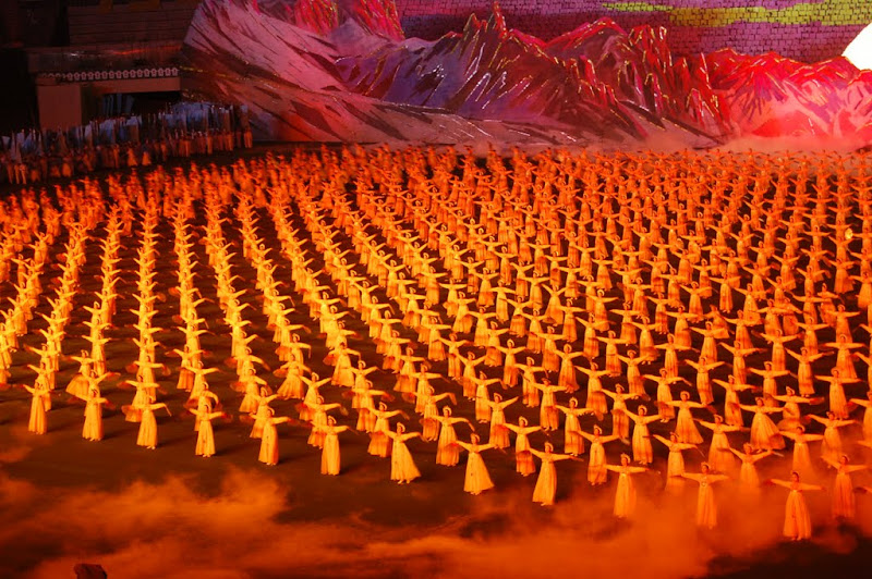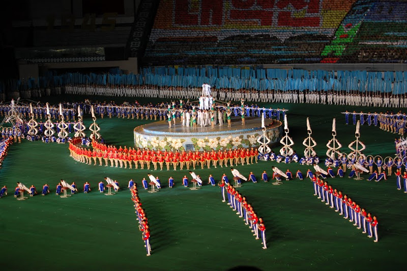 художественно-спортивное представление в мире".Вообще "Ариран" - название одной из самых известных народных песен Кореи, о любви парня и девушки. Существует в разных вариациях, вот один из них, в исполнении популярного ансамбля электронной музыки КНДР "Почхонбо".