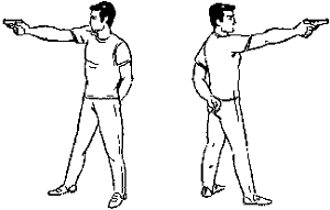 Интересно, что схожая поза с убиранием левой руки используется для стрельбы из пистолета.