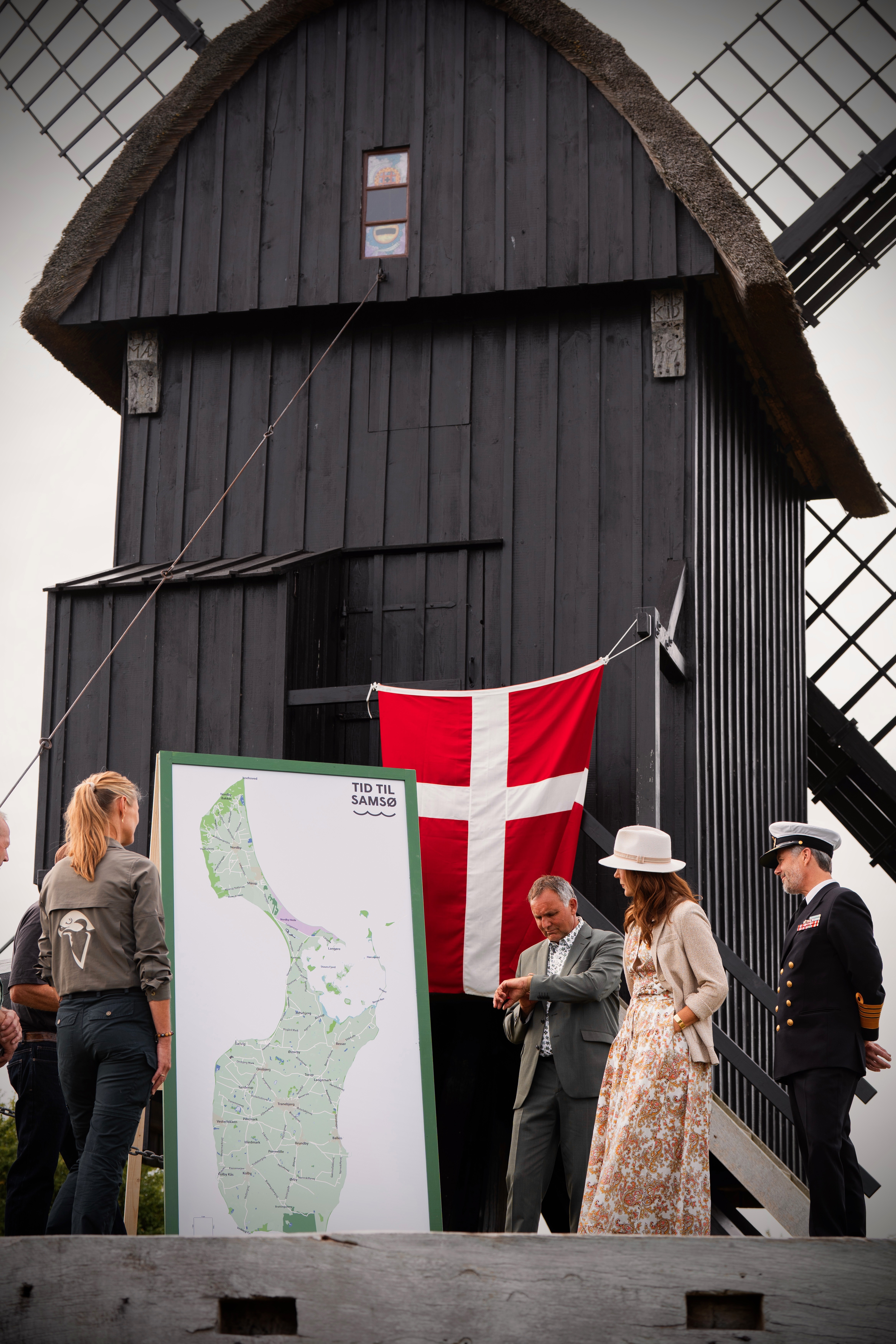 Осматривая природу Самсё в Брундбю-Стубмёлле, мэр Марсель Мейер, биолог Кнуд Тыбирк, сокольничья Луиза Ведель и землевладелец Йенс Кристиан Кьельдаль рассказали Королю Фредерику и Королеве Мэри о генеральном плане зеленого строительства острова.