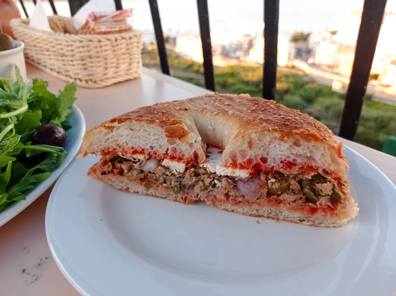 Видимо потому что слишком много красивых видов в Меллихе. Конечно же, мы предпочитали по возможности кафе с красивым видом. Одно из них нас смогло сильно и приятно удивить. Распо-ложенное в одном из самых шикарных мест - на горе рядом с церковью, с прекрасным видом на бухту, кафе кафе оказалось недорогим и вкусным по еде, со свободными местами и с детской площадкой. А еще в официантах там добро-душный и приветливый дяденька. При этом фтира и тарелка тут оказались дешевле и вкуснее, чем у понтового кафе у моря. Отдельно стоит сказать, что кафе специализируется на баре, поэто-му выбор напитков у них огромный. Правда, цена на них уже не такая гуманная, как на еду.