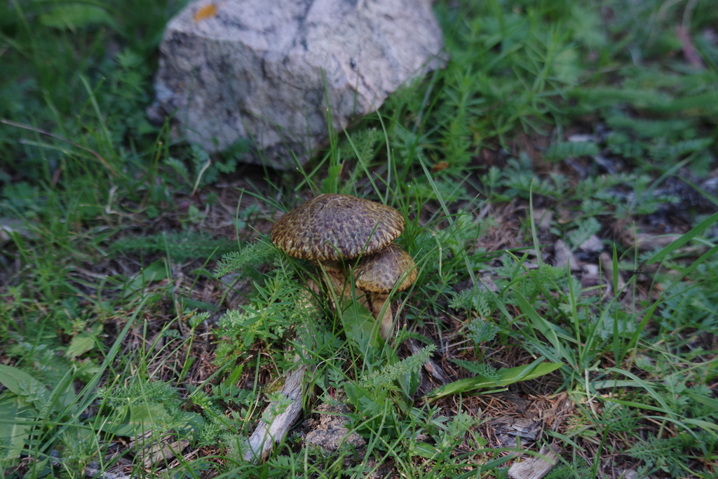 Маслёнок лиственничный Suillus viscidus. Этих уже можно было бы собрать на пожарить, но у "научной силы" времени не было, а главный несанкционированный добытчик съестного - шофер Амба - к грибам относился с легким презррением. У него были идеи получше, но о них - в другой раз.