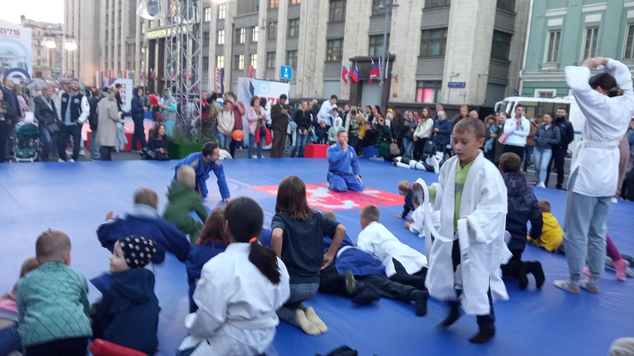 Далее несколько игровых площадок. Здесь дзюдоисты подбивают детей надеть куртку от кимоно и начать ползать по татами: