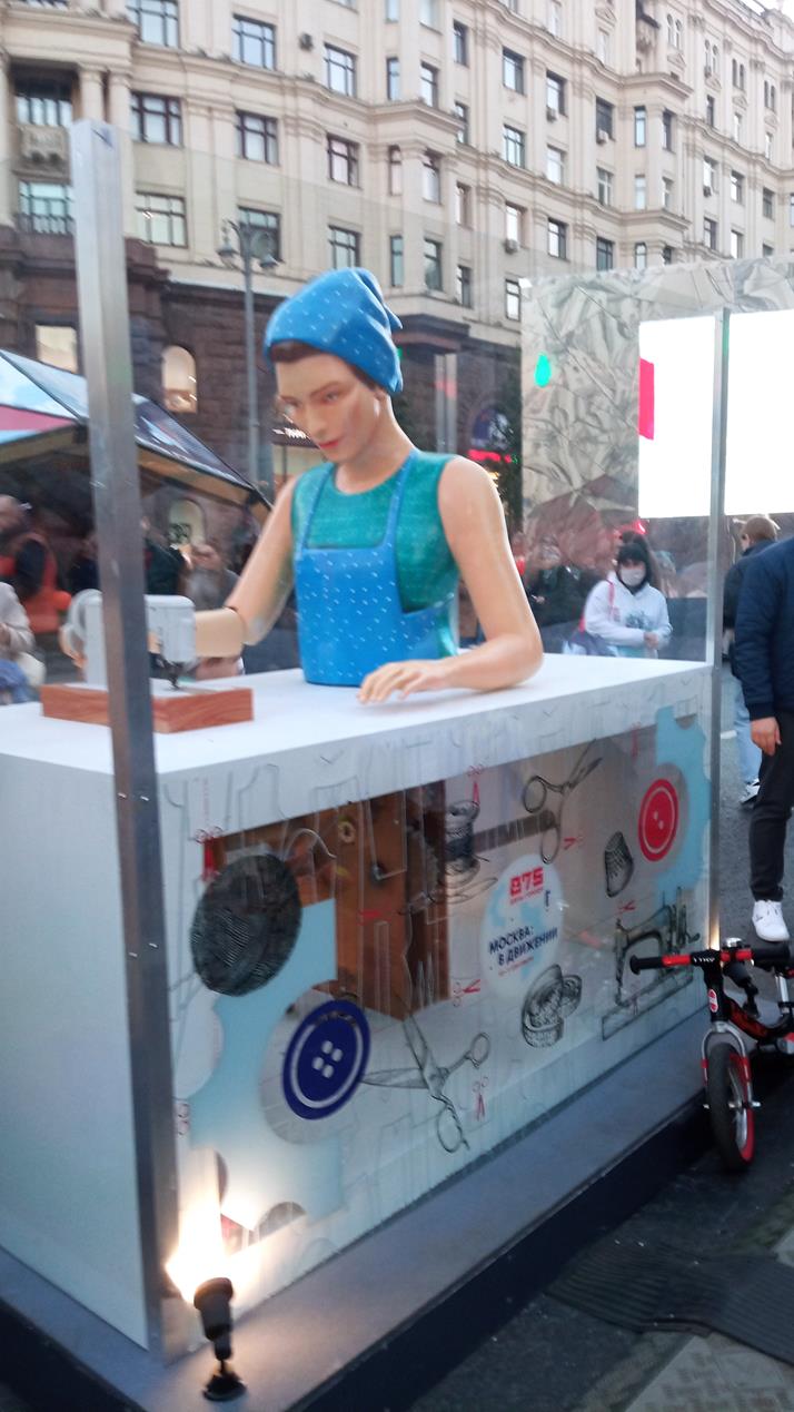 Это типа промышленный робот. У механической дамы из задницы торчит рукоятка, если ее крутить, то дама шьет. Поклонники Навального так усердно крутили, что коленвал сломался и теперь дама бездельничает с унылым видом.