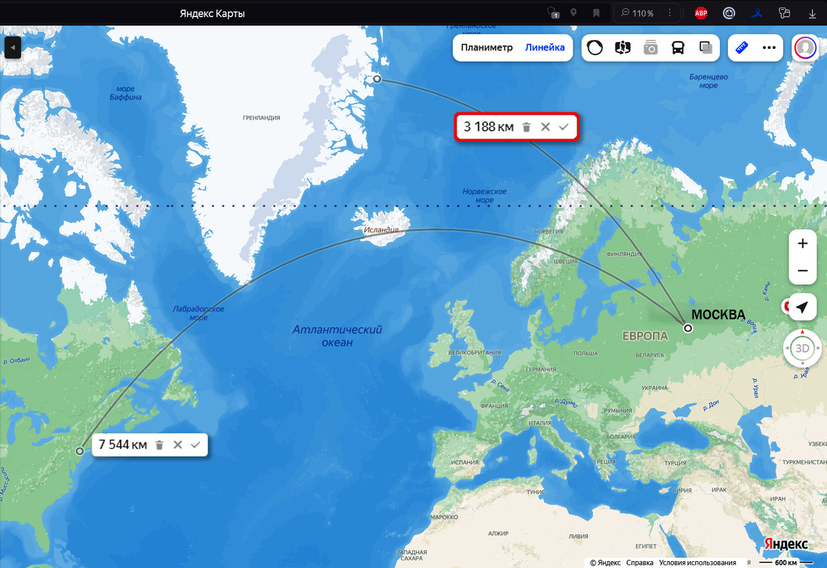 Для понимания смотрим на карту, где указаны расстояния до Москвы от восточного побережья США и побережья Гренландии: