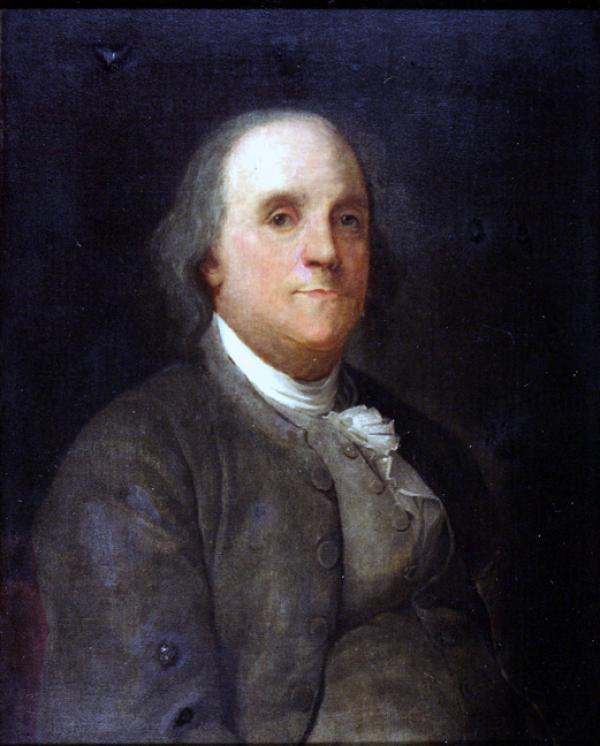 Давид создает дополнительный композиционный градиент «свадьба искусств и наук»: ее сторона – рисунки, его сторона – научные приборы. Чтобы оценить художественные способности Марии Анны покажу еще ее портрет Бенджамина Франклина. Он же тоже был ученым и посланником американских штатов во Франции в 1780-е годы. Захаживал он и в салон мадам Лавуазье, которая принимала у себя в доме выдающихся ученых своего времени:
