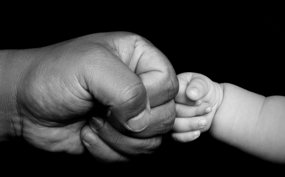 с отцом. Отец держит сына за руку. Волны удар за ударом почти