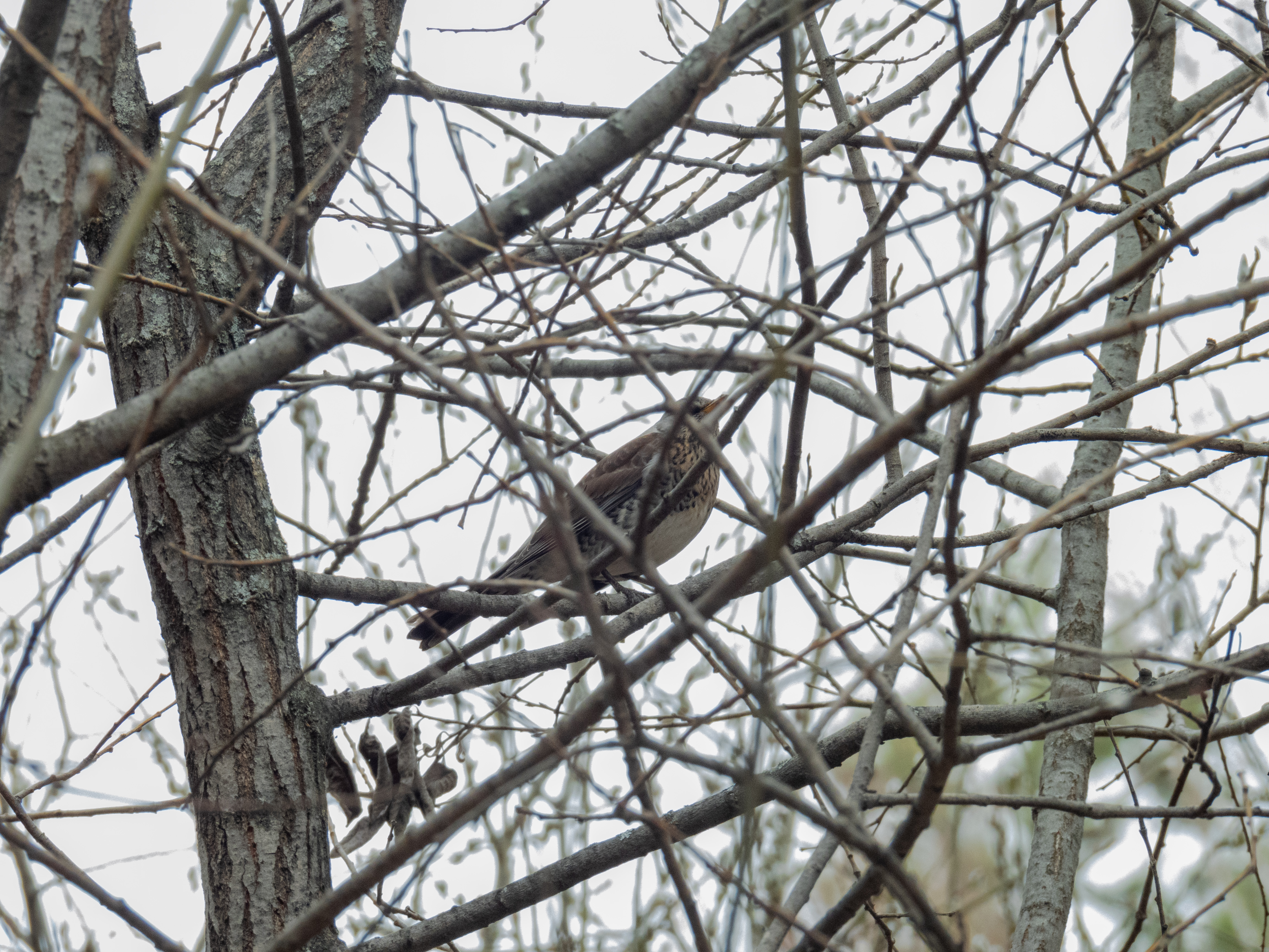 Первый раз после зимы отправляюсь на озеро посмотреть, что там и кто там. Едва зашел в лес, сразу же и добыча. Дрозд-рябинник. Несколько штук, все очень заняты. Наверное, ищут место, готовятся гнезда строить. Позировать не стали, только так, среди ветвей.