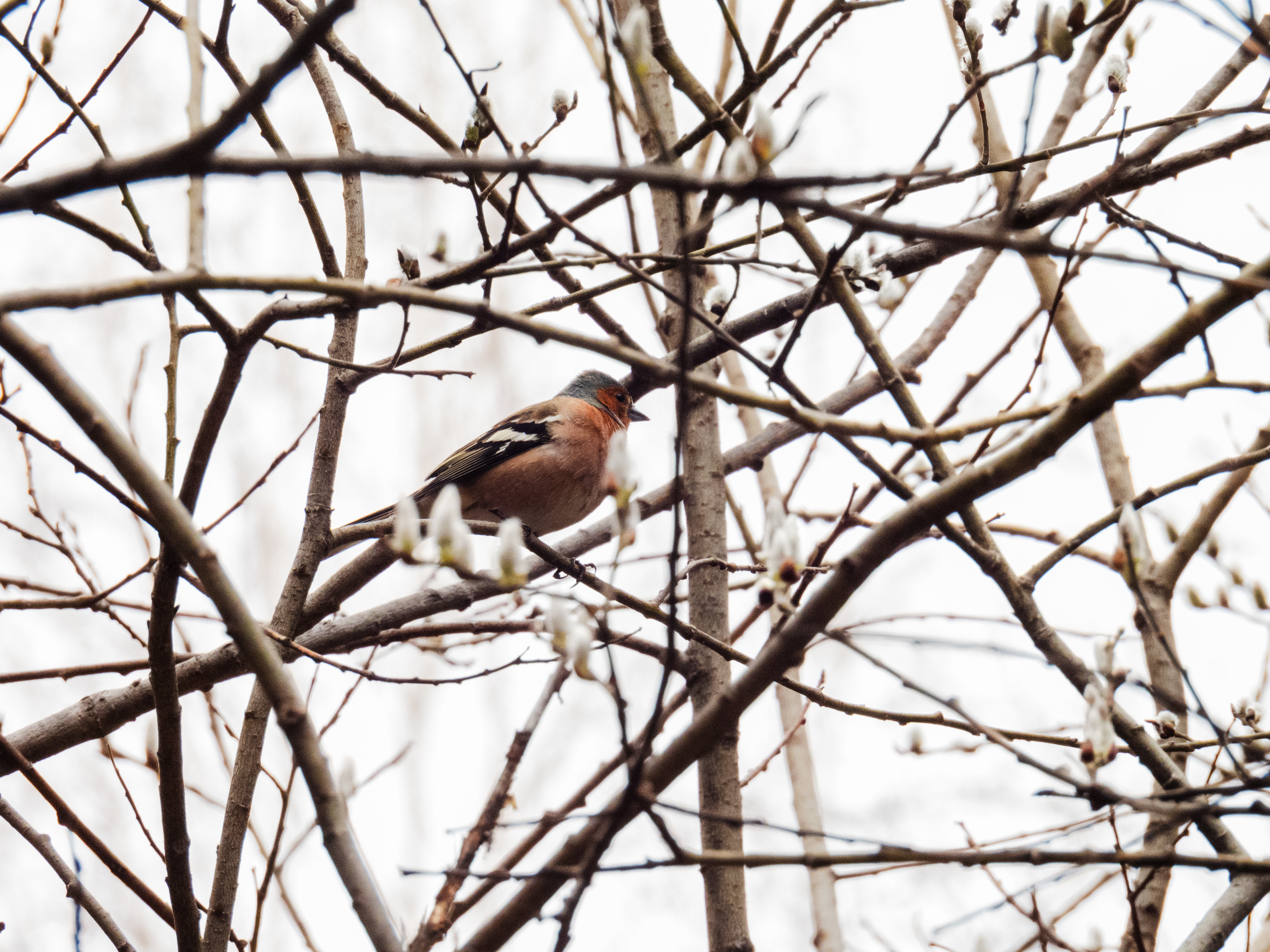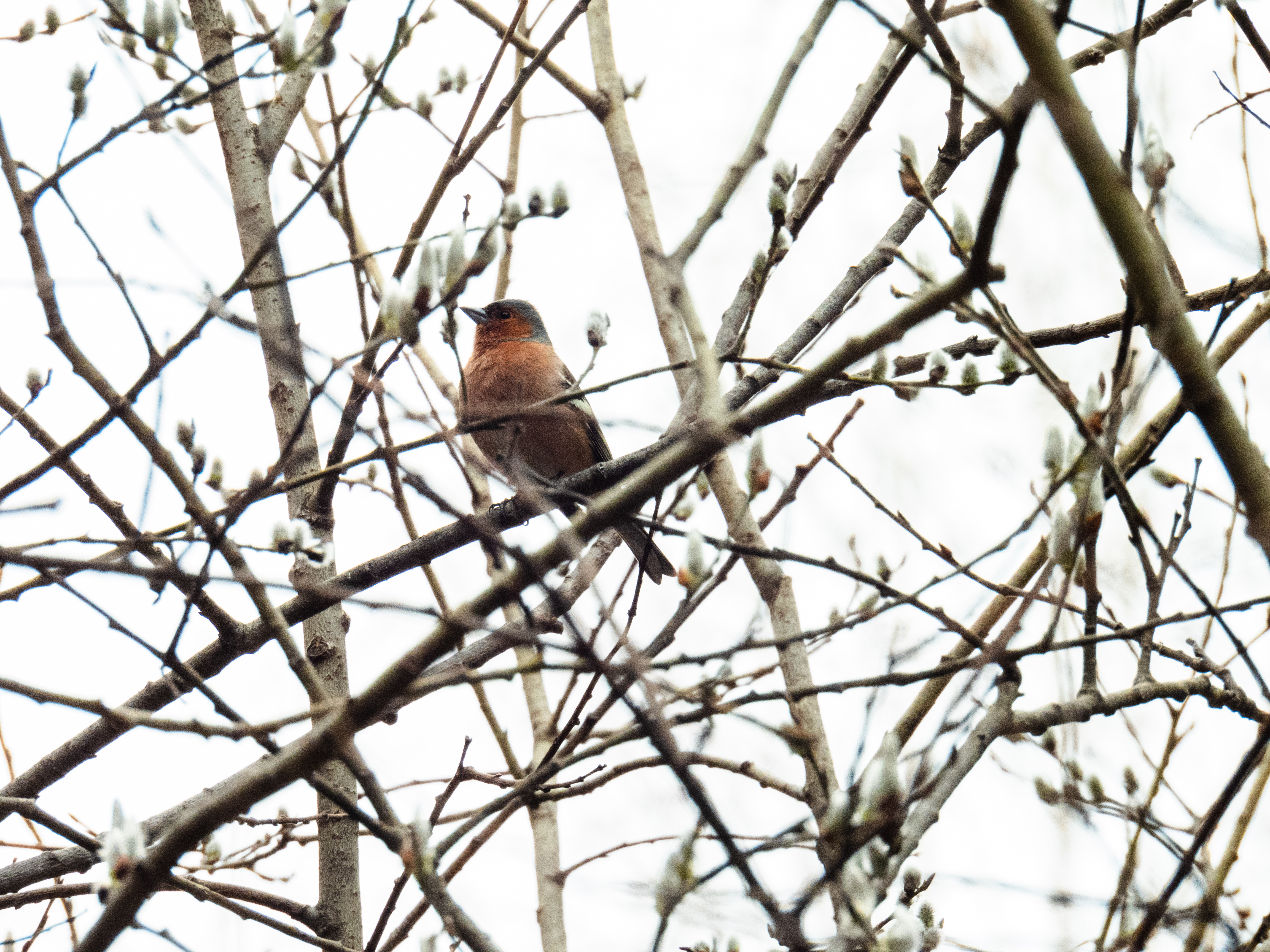 На том же дереве зяблик в брачном оперении. Этот так увлечен песней, что дал себя заснять с разных сторон.