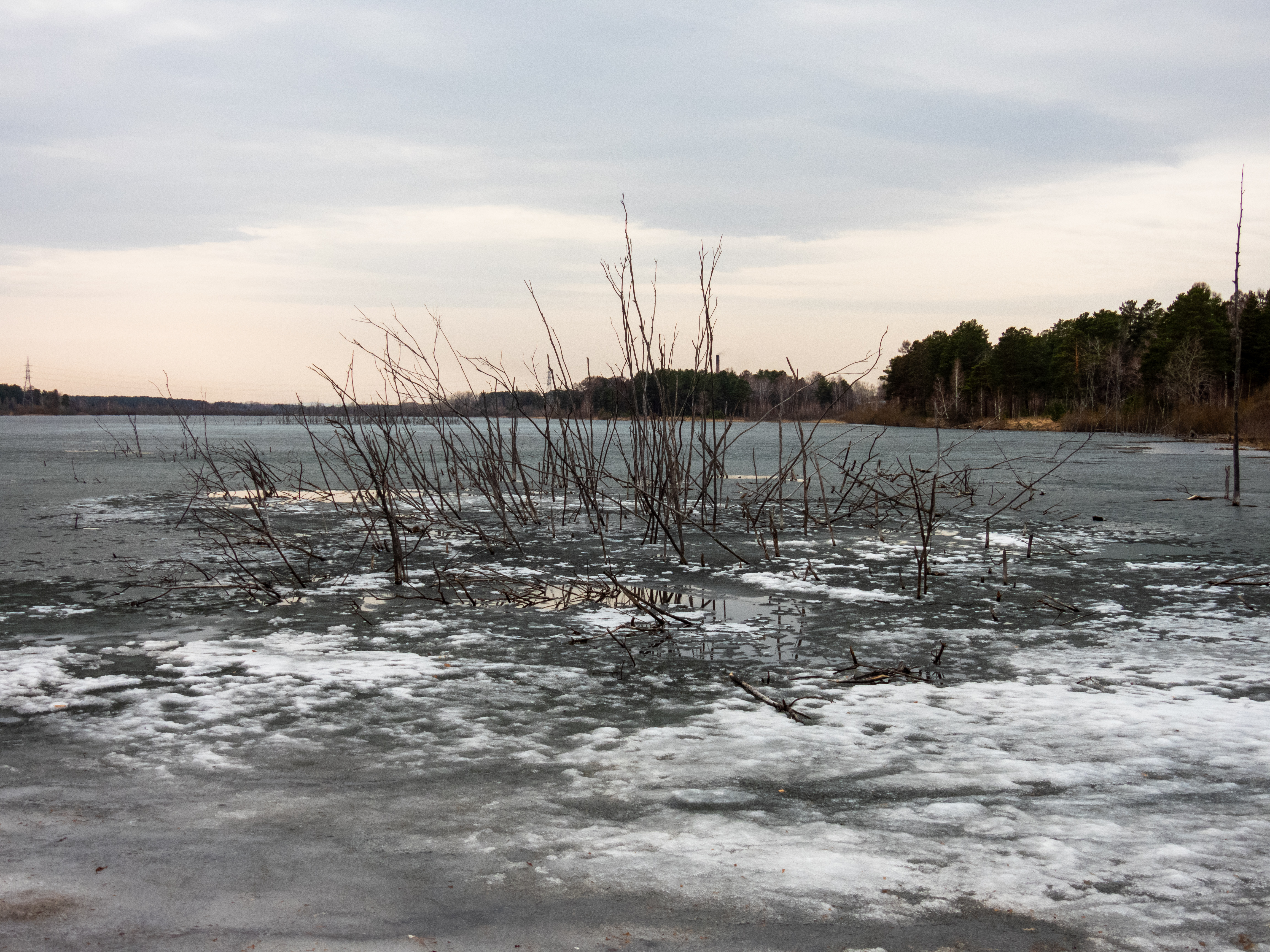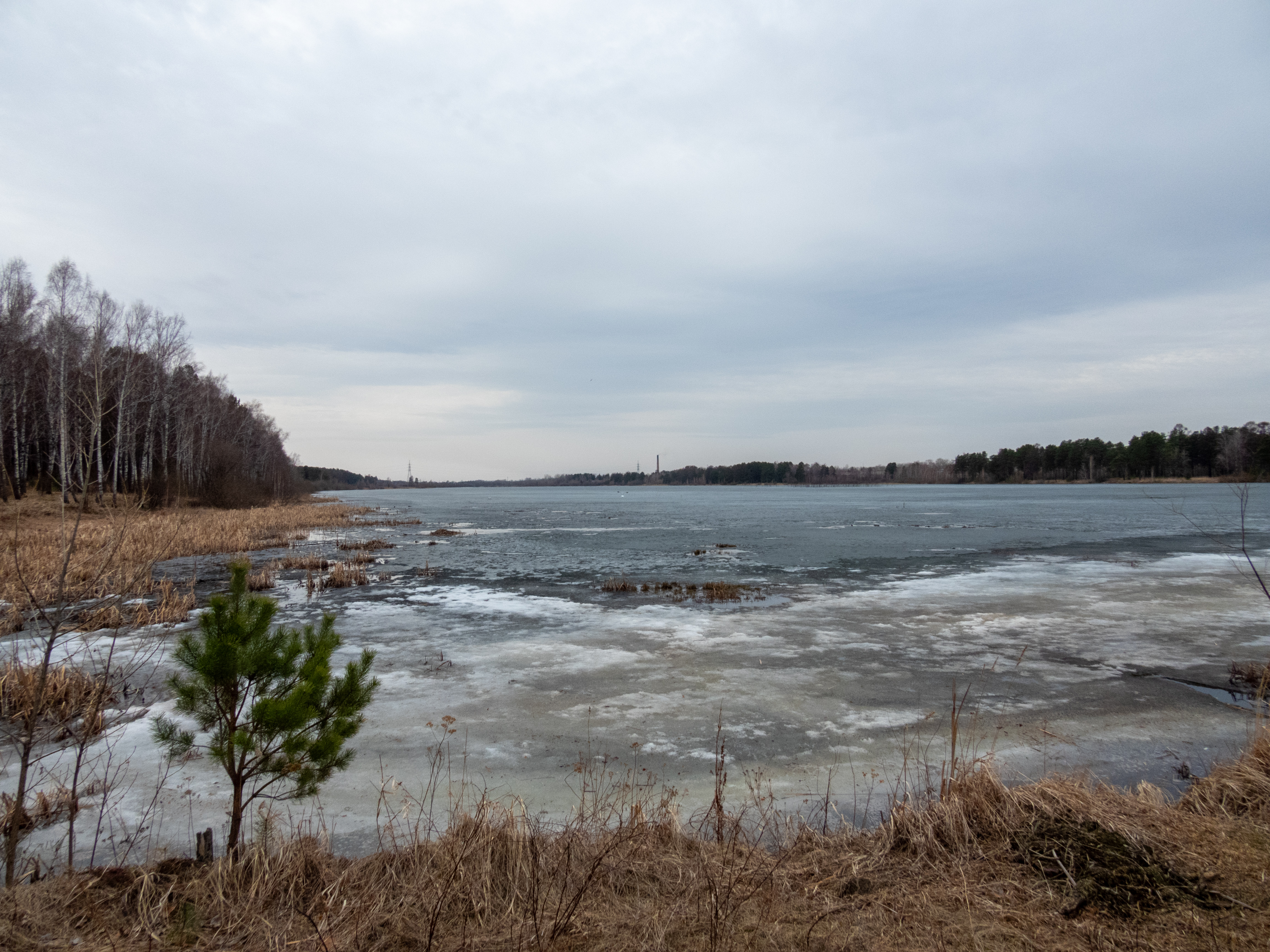 Вышел на берег. Просто снимал озеро, и только потом заметил птицу, когда уже поздно было. Но все-таки, видите в середине три точки, белую и над ней две черных? Это тушка и концы крыльев. Видно? Значит, встречу с серой цаплей засчитаем!