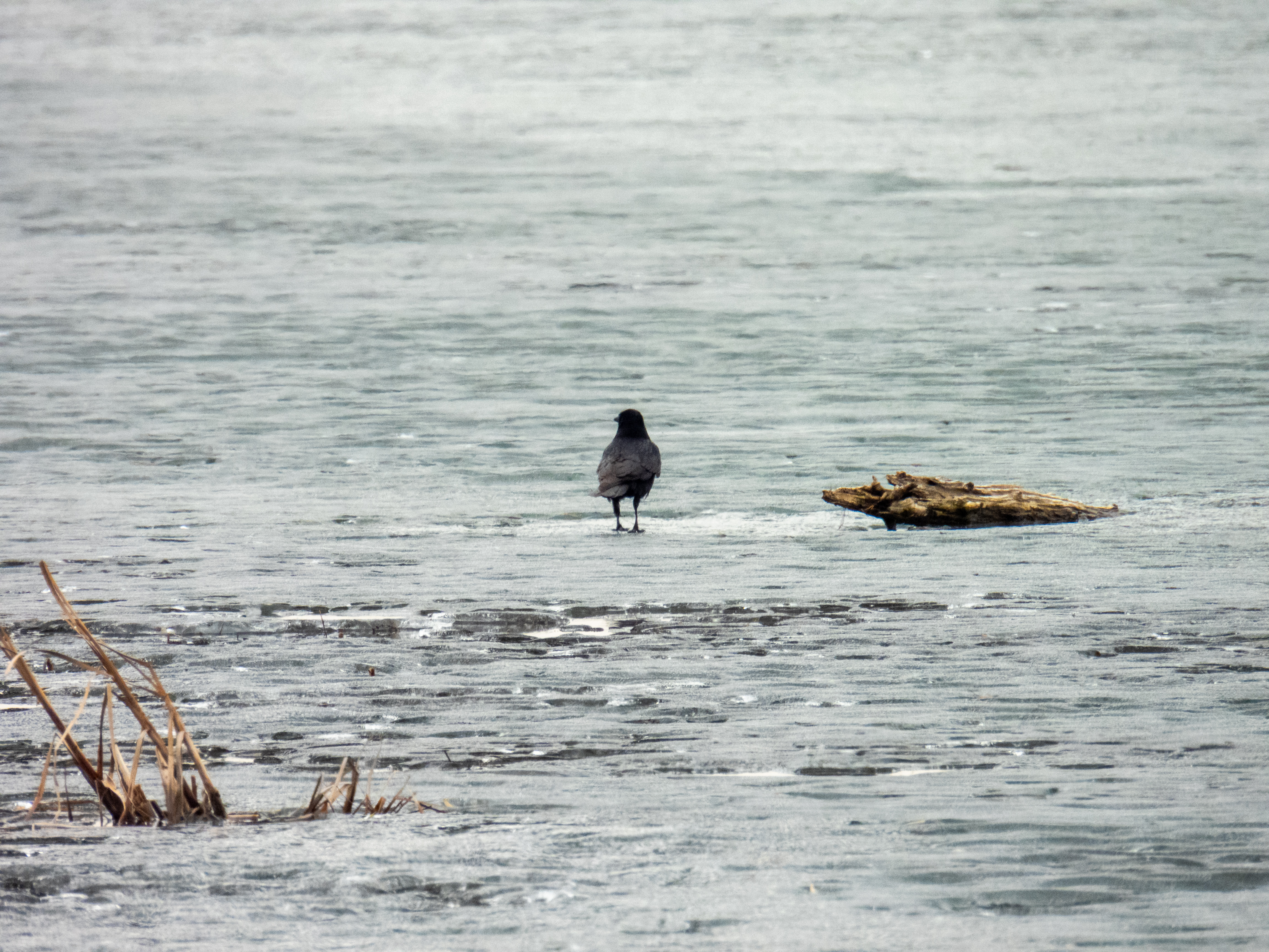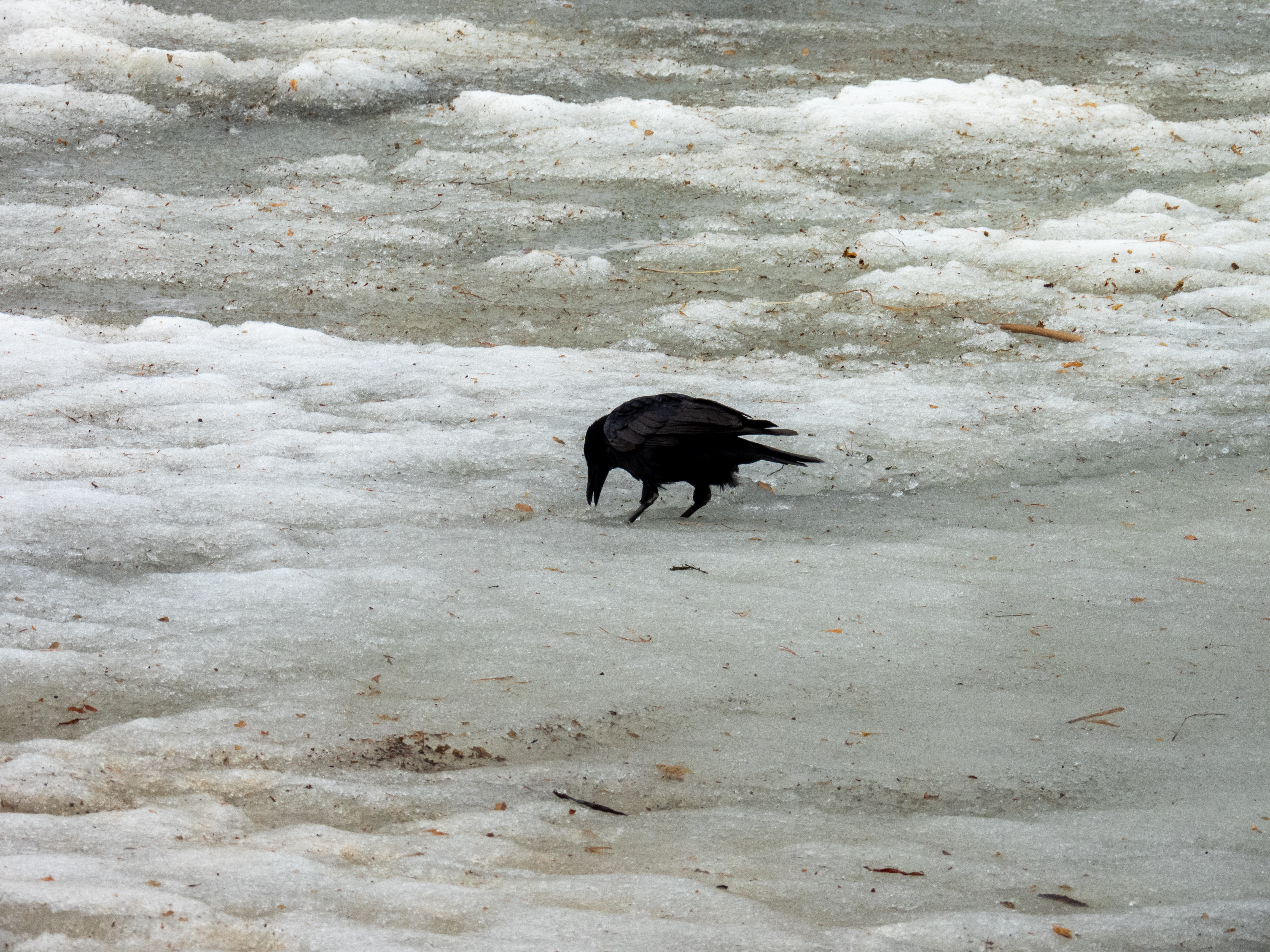 А черная ворона никуда не прячется. Что-то находит на льду.