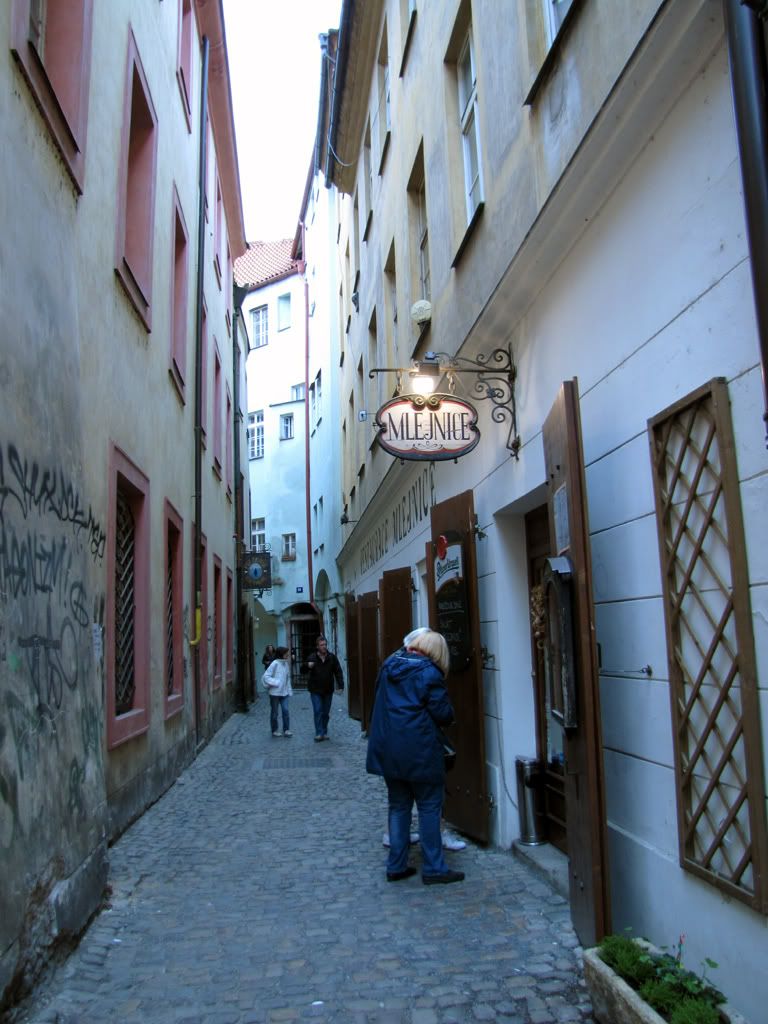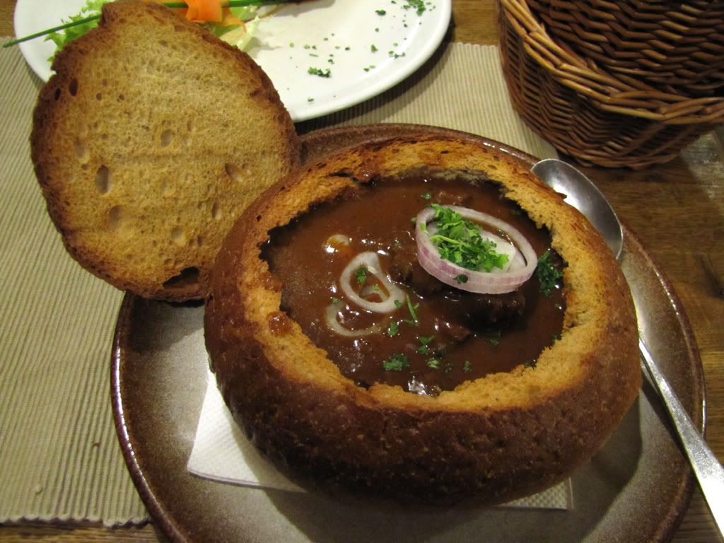 Поужинали в тот день в чотком кафе "Mlejnice", которое приметили еще во второй день. Поужинали гуляшом в хлебе, свиной косичкой с сливочным соусом и, традиционно, пивом.