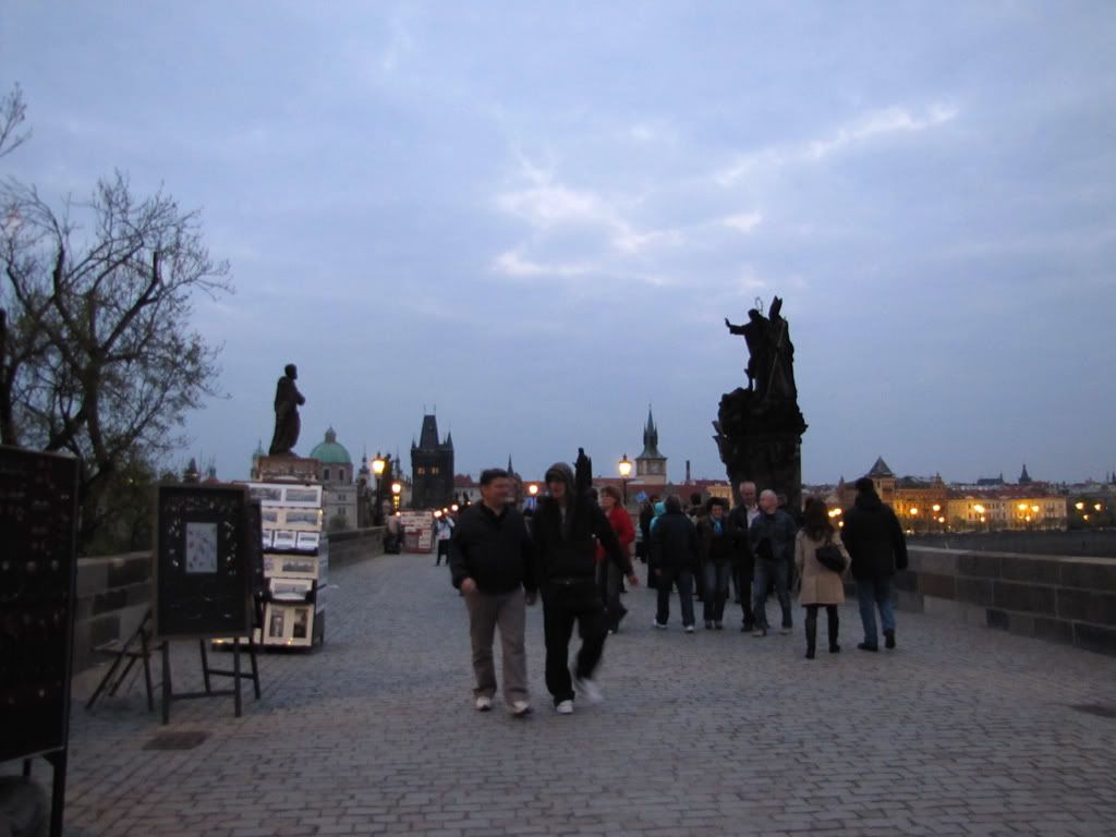 Вечерний Карлов мост плотно забит толпами туристов, продавцов всяческих безделушек и музыкантов и художников разного толка. Вот, например, дядечка, играющий классику на бокалах