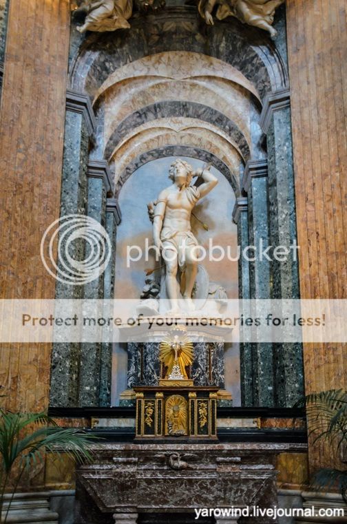 Округлый в плане интерьер впечатляет сочетанием разноцветного мрамора, позолоченной бронзы, рельефов и росписей.