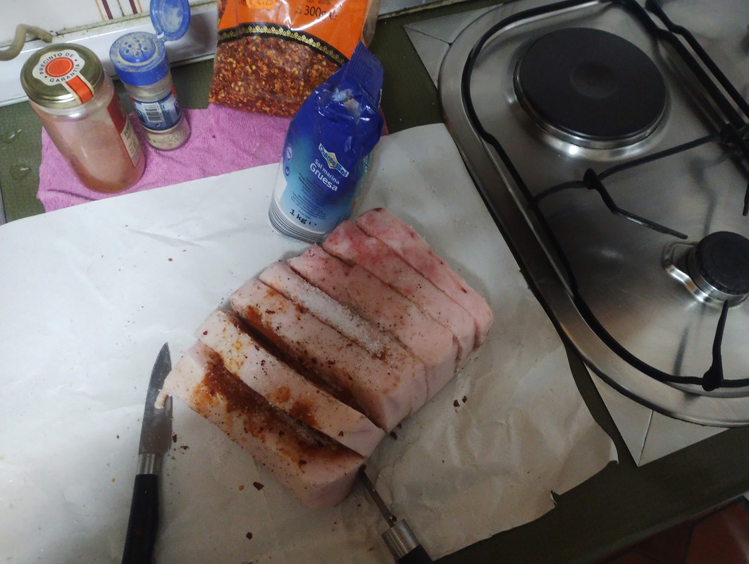 Сейчас: ‘мамоцьки́н кулинар)’ ста́йл))) - са́ло ибери́йского желудевого поросёнка в во́ ра́зных пе́рцах.