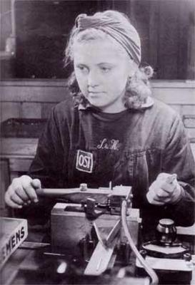 Это фото молодой советской девушки, работающей в цехе одного из предприятий компании "Сименс" во время Второй мировой войны. Её статус обозначен нашивкой на спецовке: "Ост" , т.е., "восточный рабочий". Скорее всего, её насильно вывезли в Германию в результате одной из многочисленных облав, организованных немцами на оккупированных территориях Советского Союза в 1942-44 годах.