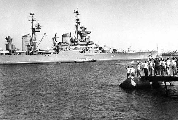 Местные жители приветствуют советский военный корабль