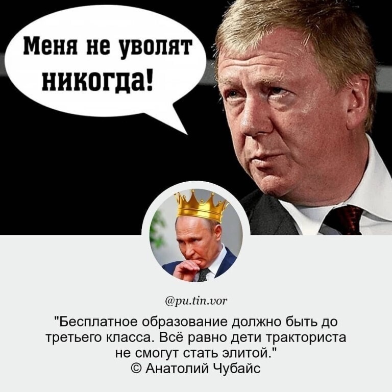 О результатах деятельности Чубайса и его подельников.Уже мало кто помнит, как там говорил Чубайс, проводя форсированную приватизацию или по-русски говоря хищение общенародной собственности в особо крупных размерах, группой лиц, по предварительному сговору?