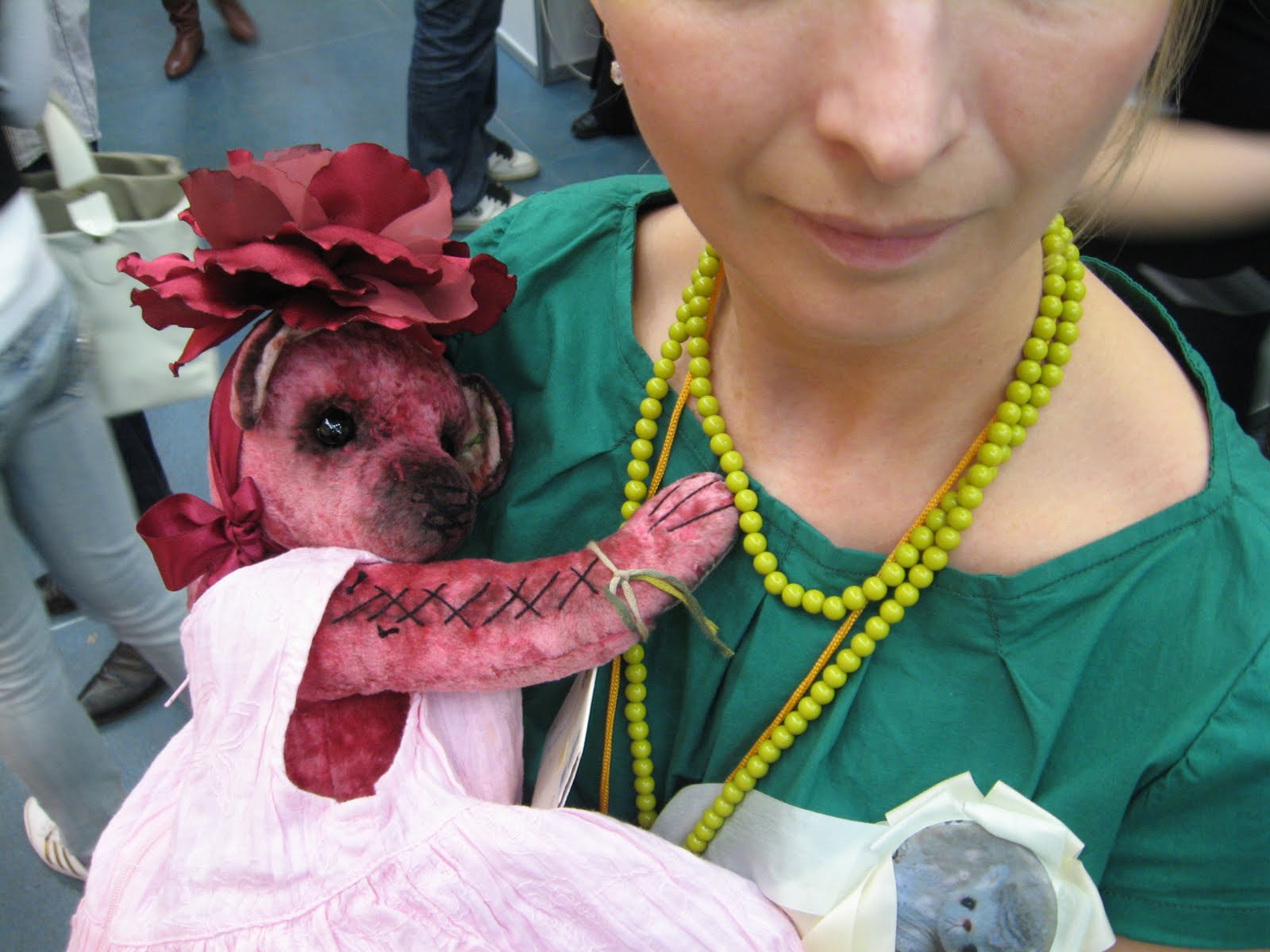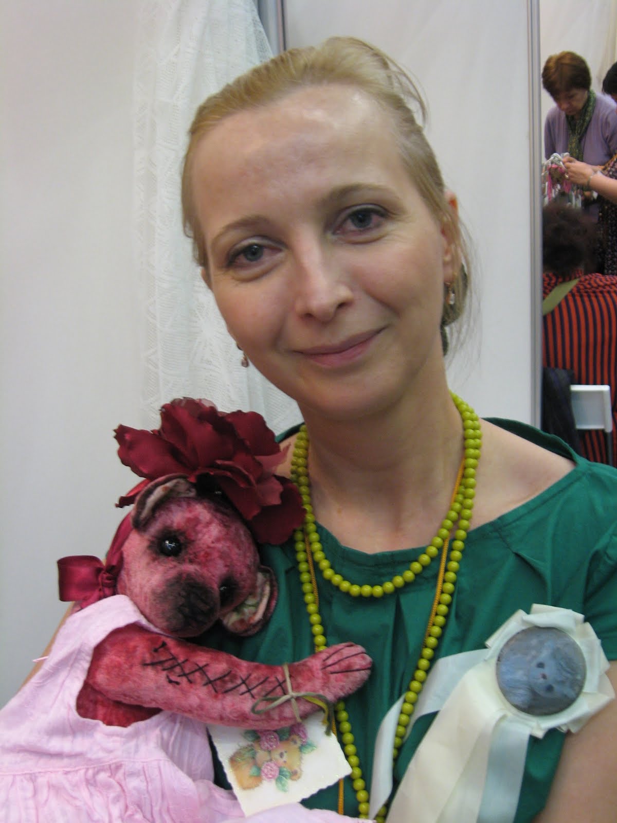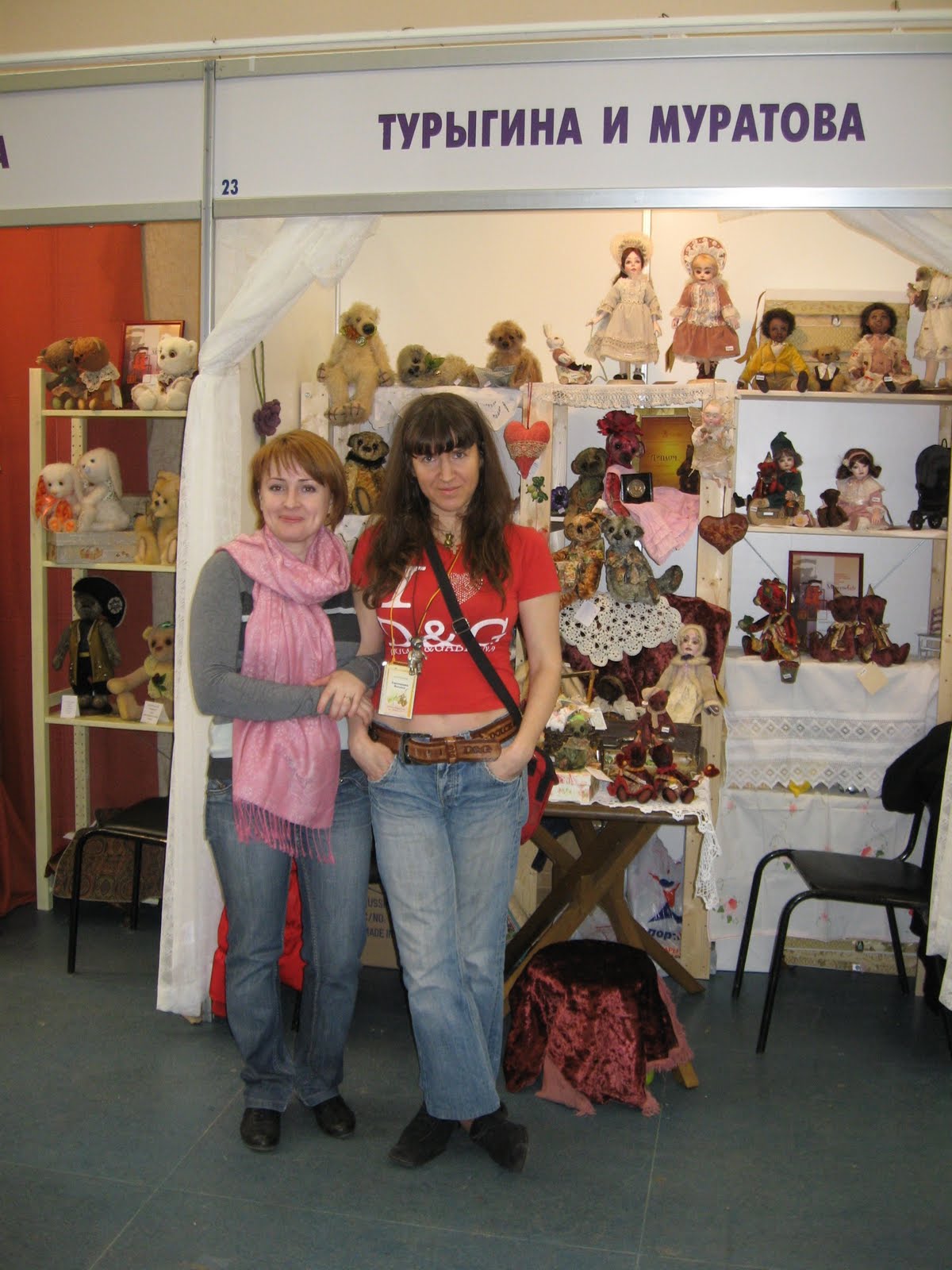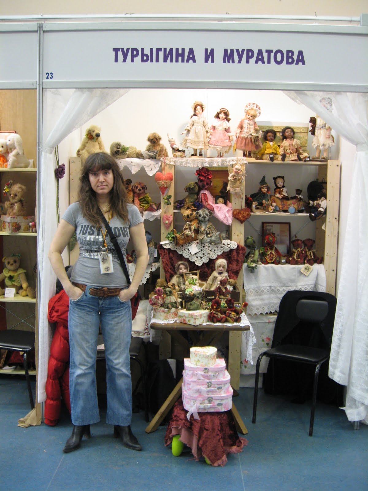 В этот раз впечатления от выставки у меня остались довольно противоречивые. Начнем с того, что время её проведения удивительным образом совпали со Страстной неделей и Пасхой, плюс не зависящие ни от кого обстоятельства, а именно - терракт в московском метро, вообщем, вспоминая свою первую МФ год назад, это было, что называется, "небо и земля" в смысле числа посетителей. Если на МФ-2009 по всему периметру выставки практически каждый день возникали человеческие пробки, пройти было просто невозможно, если, не дай Бог, ты отходил от собственного стенда что-нибудь купить или с кем-то пообщаться, у тебя были слабые шансы быстро вернуться на своё место. Люди реально стояли плечом к плечу, чтобы продвинуться хотя бы на метр вперед. В этот раз дня три большую часть дня было реально пусто. А "очень много людей" было пару-тройку часов за все эти дни... Плюсом было все остальное))) Выставка - это такой праздник, всегда))) Я очень рада, что познакомилась со множеством теддистов, с которыми мне не удалось встретиться на прошлой выставке. Очень приятно, что многие люди в жизни оказались просто изумительными. Ина Смирнова из Вильнюса, Наташа Дудинова, Рина Буше, Катя Беспалова,Наташа Гортункова, спасибо вам большое, я очень рада знакомству с вами. Я встретилась со многими девочками, с которыми до этого общалась только виртуально - Света Михайлова, Наташа Толстыкина, и ещё много-много людей, было очень интересно увидеть их и пообщаться в реальной жизни. Девочка-кукольница Оксана Муратова, с которой мы делили стенд - очень светлый, позитивный, очень интересный человек, я знаю её давно и рада, что она такая, какая она есть))) Вот тут её впечатления о выставке http://oksanamuratova.livejournal.com/12846.html. На фотах очень много меня, вы только не подумайте, что я страдаю нарциссизмом, просто мне так понравились эти фотографии, которые сделали Света Михайлова и Оксана Муратова, что я захотела оставить их все)))))) Посколько в дни выставки моя младшая дочка плохо себя чувствовала и я проводила довольно бессонные ночи, вид у меня был ещё тот, а на этих фотах вроде очень ничего))))