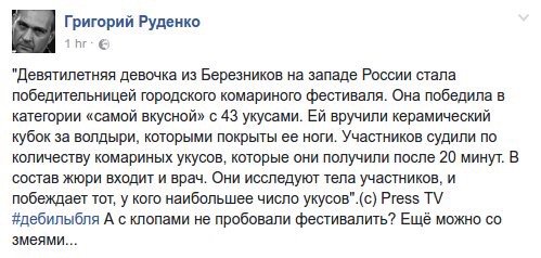 россиянкуНа Фестивале русского комара жюри определило «самую вкусную» россиянку. Ей оказалась девятилетняя девочка, которая получила 43 комариных укуса. Жюри осматривало тех, кто стал жертвой комаров, и выявляло среди них самого пострадавшего, сообщает Press TV