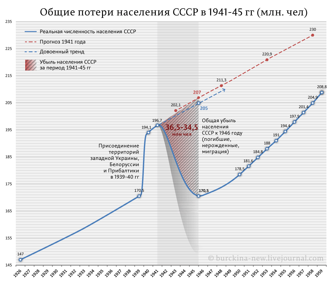 А если считать от предвоенного демографического прогноза, согласно которому население СССР к 1945 году должно было вырасти до 207 миллионов человек, то выйдет все 36,5 миллионов.