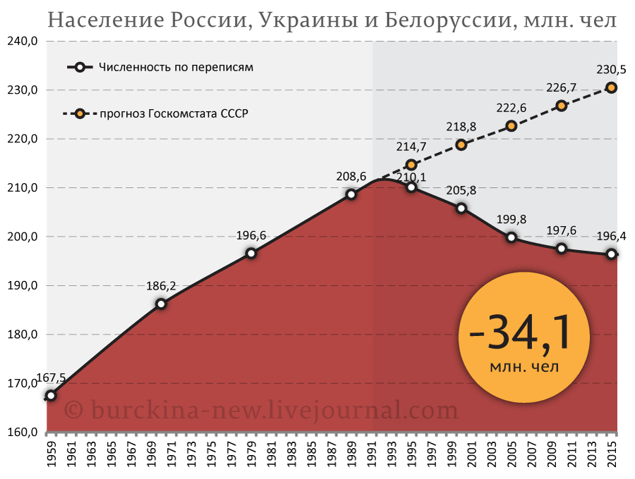 В реальности потери составят еще большую цифру, если считать в России, к примеру, строго русских, а не всех россиян, т.к. русские вымирают еще быстрее, чем падает общая численность всего населения.