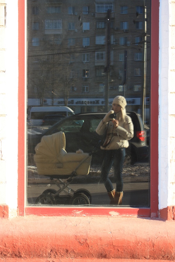 Но уже половина четвертого, пора на прогулку. Радует отличная погода и наше отражение в витринах магазинов по пути в парк.