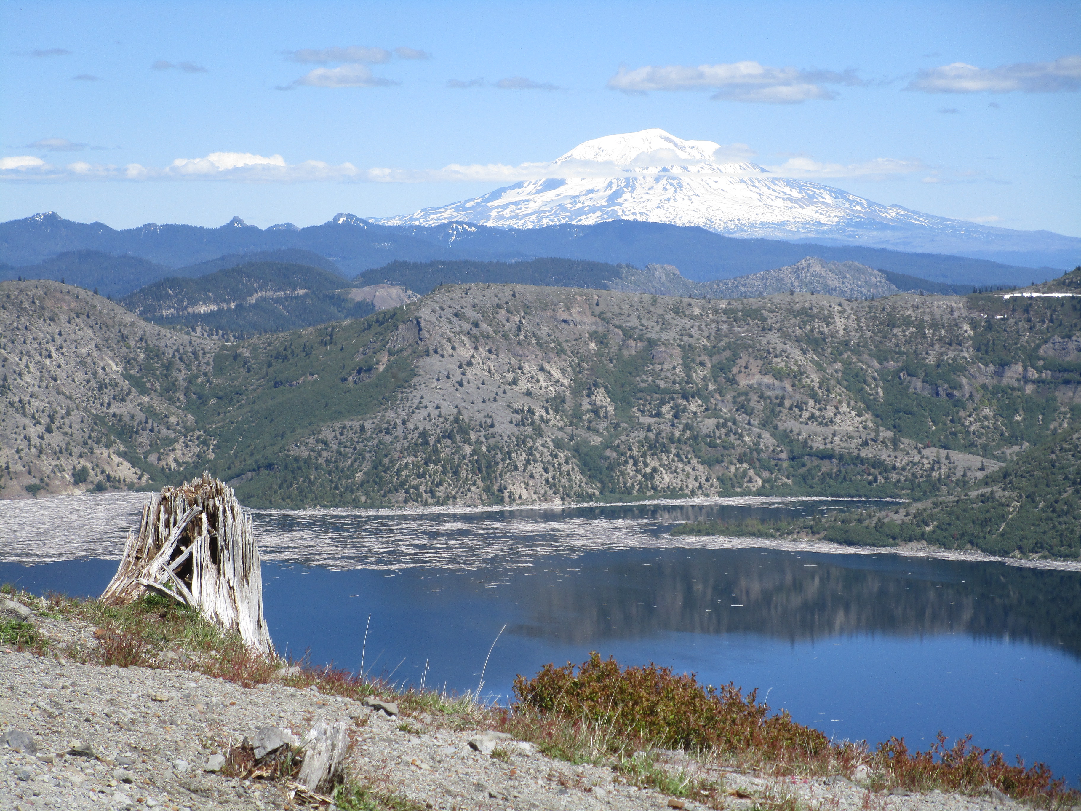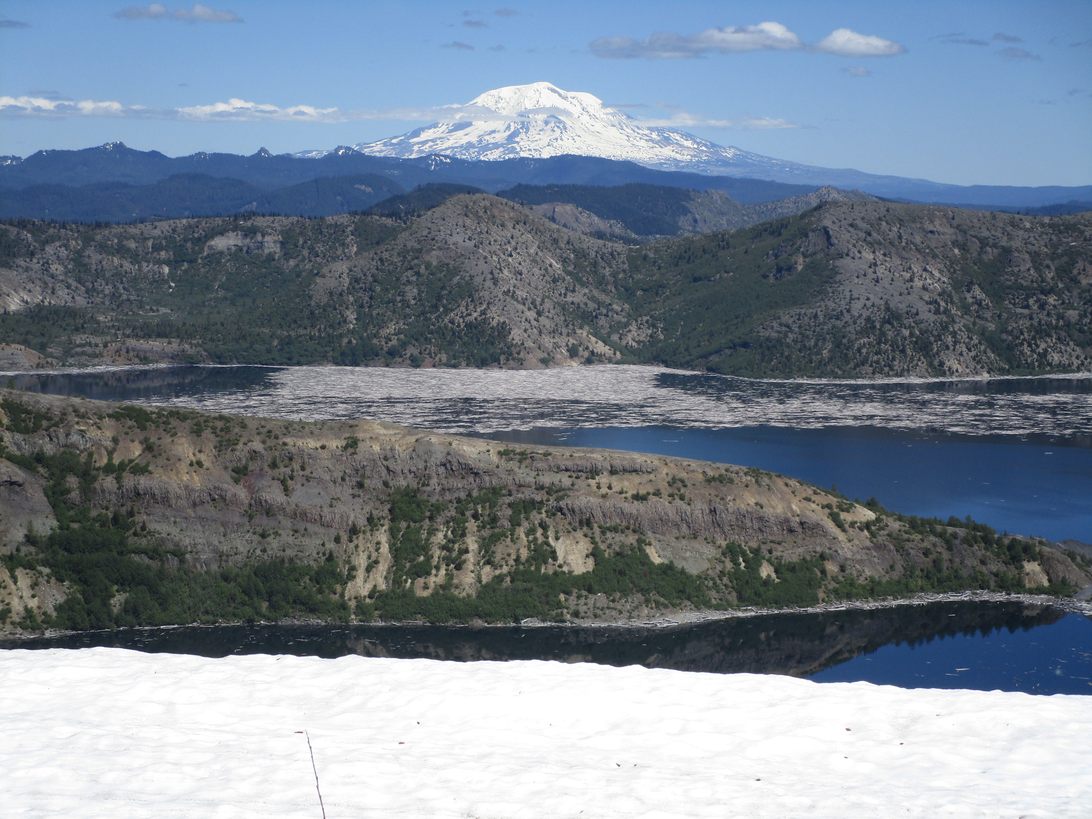 С хребта видно три больших вулкана. Сент-Хеленс с её разверзнутой северной стороны можно и с парковки рассмотреть. А вот, чтобы увидеть Адамс (вторая по высоте вершина Вашингтона) надо подняться повыше. Он расположен относительно близко от Сент-Хеленс, и в ясную погоду возвышается снежной шапкой за Spirit Lake.