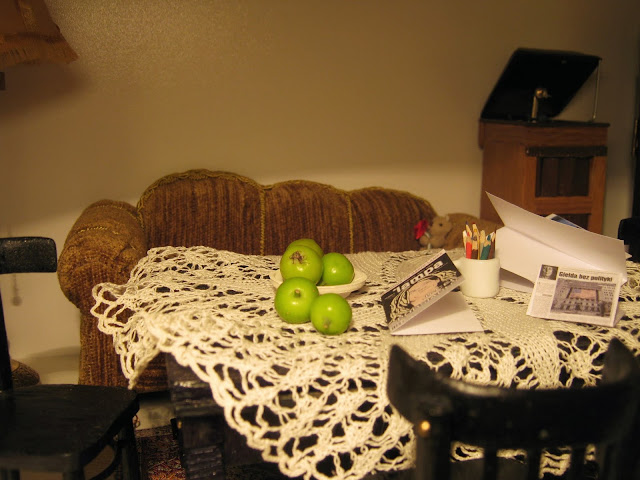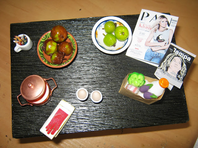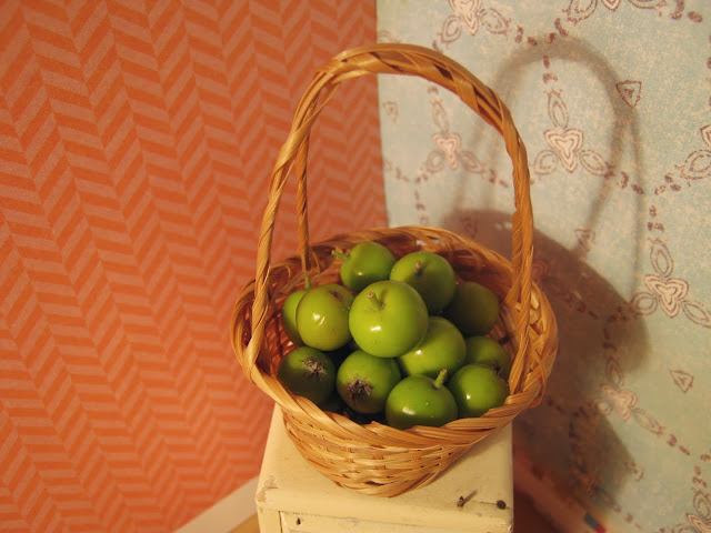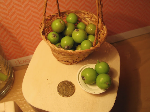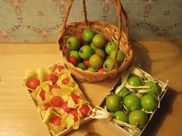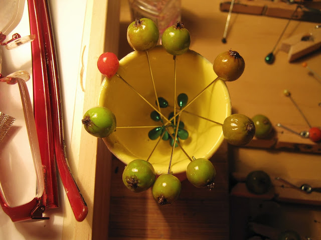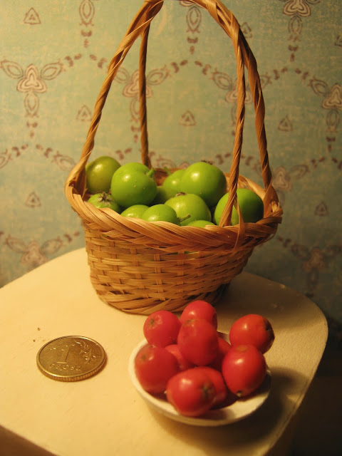 Красные яблоки и помидоры кораллами рябины окрашены прозрачным лаком для дерева.